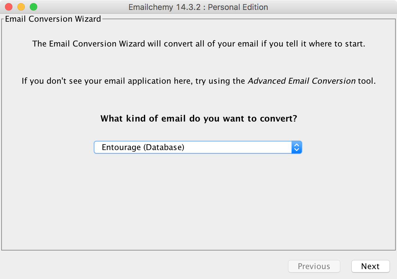To start, install Emailchemy and activate your license. Then, in Emailchemy, select “Entourage (Database)” from the drop down and click the Next button.