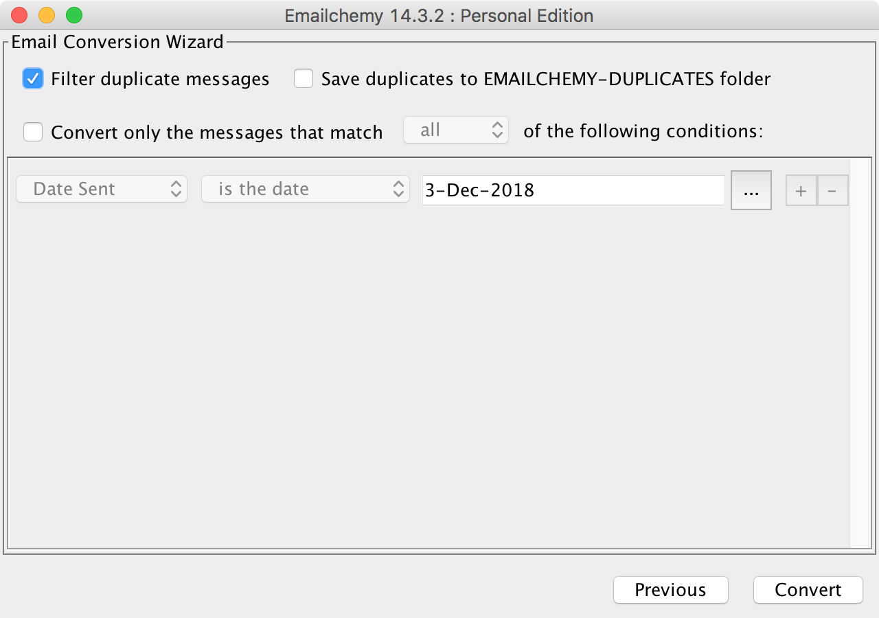 Next, you can set up a filter to include or exclude certain messages, or you can ignore the filters completely and just click the Convert button to convert everything Emailchemy finds in the Microsoft User Data folder.