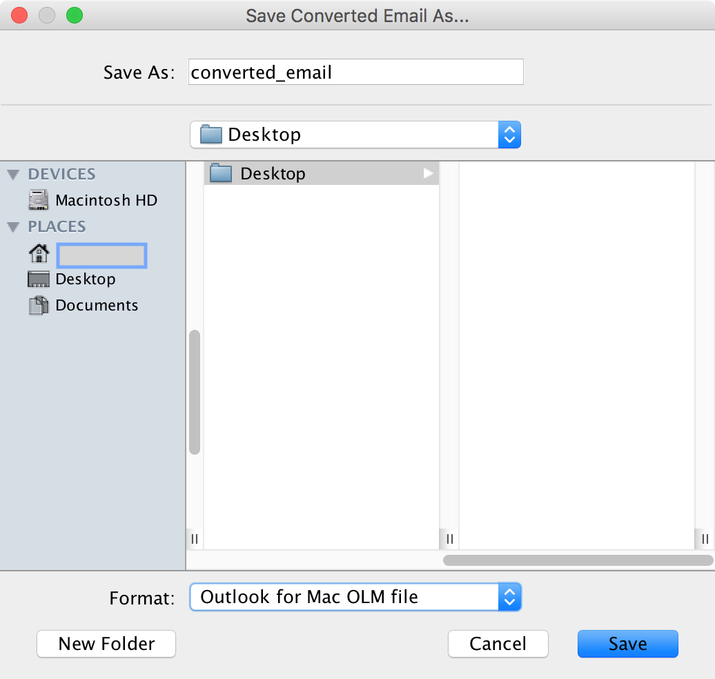 Finally, you need to tell Emailchemy to save your converted email as an Outlook for Mac OLM file. Make sure you select “Outlook for Mac OLM file” from the dropdown at the bottom of the Save dialog. The default name is “converted_email”, but you can change that to anything you’d like. The “.olm” extension will be added automatically, so no need to enter that here. Click Save to begin the conversion.