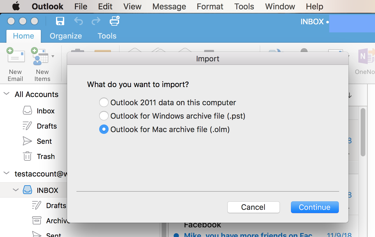 Now you just need to go into Outlook, select Import from the File menu, select “Outlook for Mac Archive File” and then Continue where you select the OLM file you created with Emailchemy.